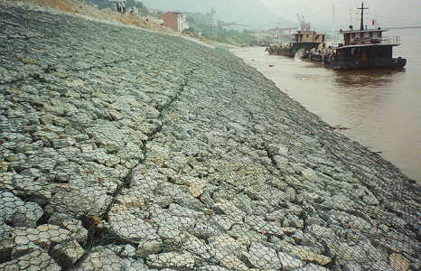 雷諾護墊護坡也叫石籠護墊護坡,格賓護墊護坡,是指由機編雙絞合六邊形金屬網面組成的厚度遠小于長度和寬度的墊形工程構件。雷諾護墊中裝入塊石等添補料后毗連成一體,成為重要用于水利堤防、岸坡、海曼等的防沖洗布局,具有柔性、對地基順應性的長處。