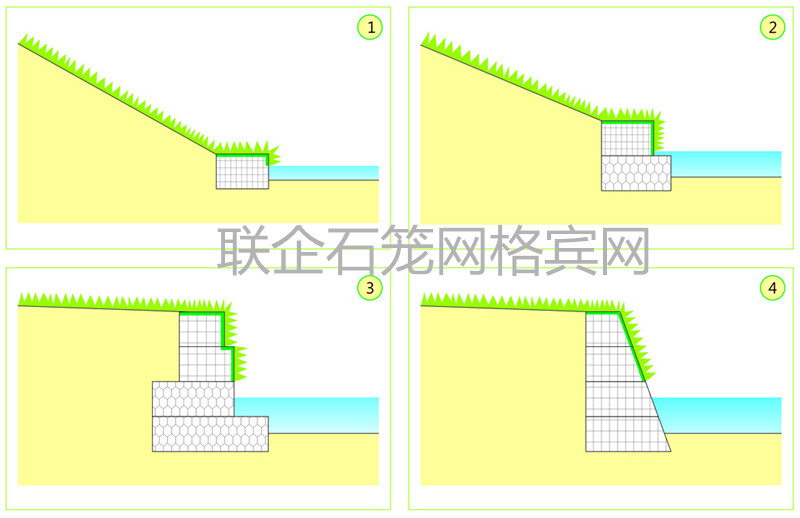 為了減輕湍急的水流沖刷河堤,在河堤的內側或者河槽的邊緣,鋪石籠網箱或者石籠網墊,洶涌的河水直接沖擊石籠網箱或者石籠網墊,這樣保護河堤或者河槽。河水在彎曲的河道處,由于遇到石籠網箱或者石籠網墊,河水就會拐彎,順著固有的河道流淌。這樣就引導河水按安全的方向順利通過。